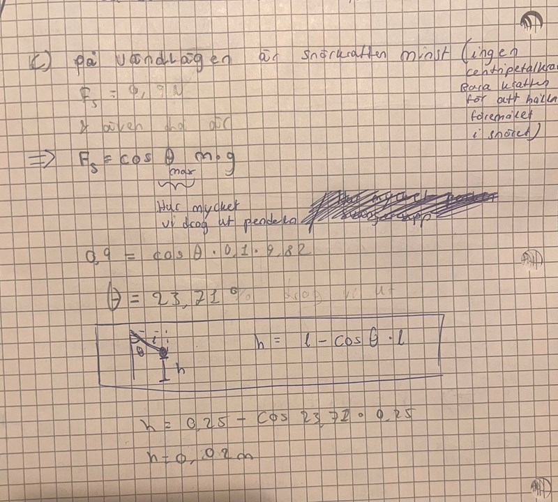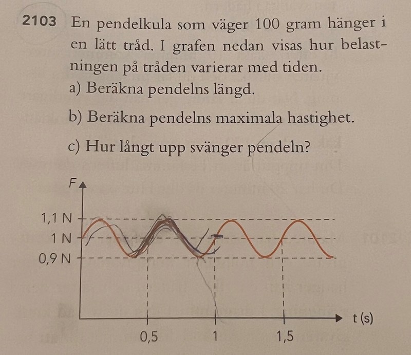 Snörkraften är lägst vid vändlägen, Dvs Fs= 0,9 enligt grafen. Och den har massa 0.1kg.