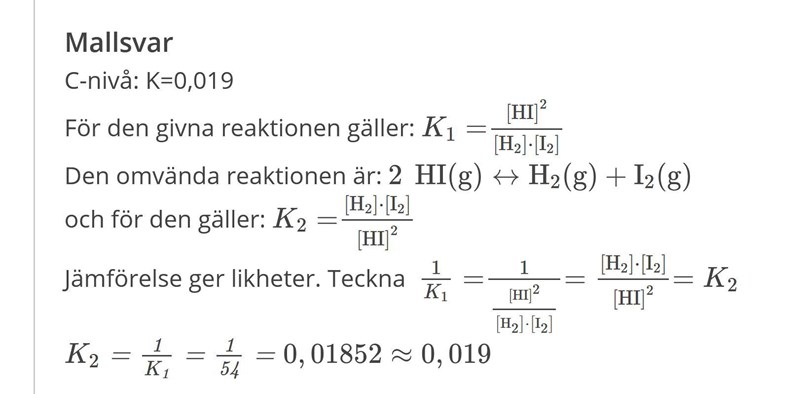 Jag börjar seriöst fundera på att skaffa en privatlärare, för det funkar inte för mig att plugga på distans - jag förstår inte, jag fastnar, jag är helt "in over my head". Jag kommer ingen vart i kemi, inte för att jag inte fattar kemibiten, utan för att jag inte fattar mattebiten. Säg den här ekvationen, t.ex. Jag har tittat på och försökt få in reglerna för division och multiplikation, men ändå kopplade jag inte att det fanns nån slags samband som skulle lösa upp problemet av vad som händer om man byter plats på täljaren och nämnaren. Frågan var vad K blir, för samma temperatur, för reaktionen i omvänd riktning. K i riktningen H2+I2 <-> 2HI var 54. Jag fattar att jag ska byta plats på dem, och sen kommer jag ingen vart. Här är mallsvaret: