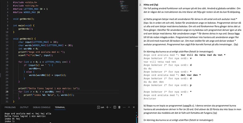 Hej! Jag har testat fgets också, men utifrån vad jag kan se ger den exakt samma sak? Efter provet googlade jag lite på lösningar och då kom strtok funktionen upp, men den har aldrig nämnts under kursens gång så jag tror inte det är den metod som vi önskats använda.