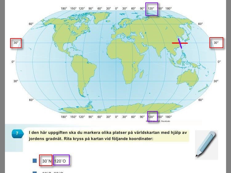 120 grader Ö betyder att man har gått vinkeln 120 grader österut från nollmeridianen (man har bestämt att den går genom stadsdelen Greenwich i London). Jag har markerat den longituden i lila.
