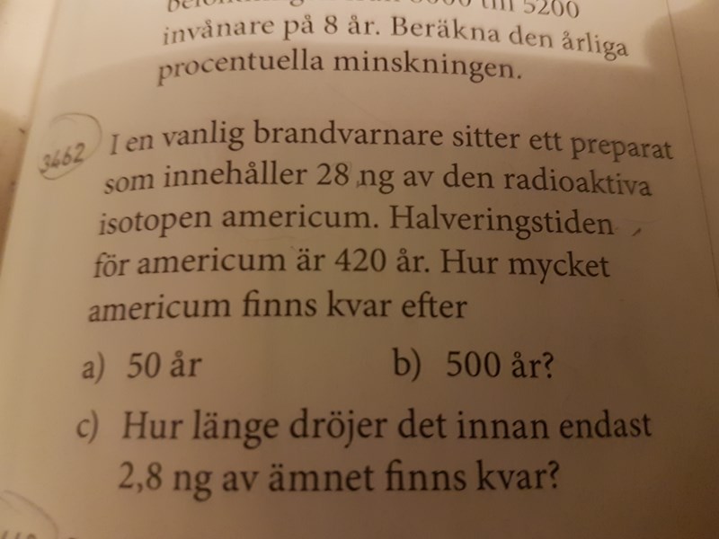 Först ville jag få reda på a:et i formeln y=c×a^x . 14×10^-9=28×10^-9×a^420. Delade båda sidor med 28×10^-9, vilket gav 0.5= a^420. 0,5^1/420 = a. a = 0,9983510106 = 0,998