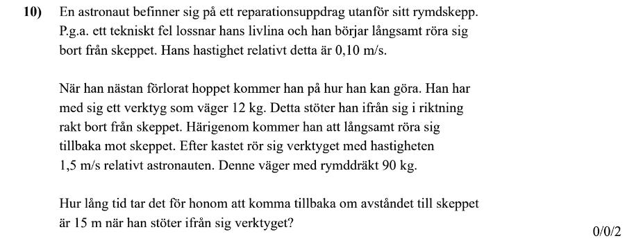 Är | (90-x)*0.1=(90-x)v+90*1.5 | en bra början. Då vi får att rörelse mängden före och efter kastet är lika stora, Där vi även får med ett samband på vikten av astronauten och verktyget.