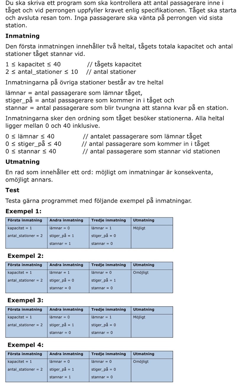 Vid varje station måste du kontrollera om antalet passagerare som går på är rimligt (räcker kapaciteten?) och antalet som går av (det kan inte gå av fler än vad som finns på tåget).