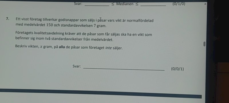 Om maximal avvikelse är 2*7=14 är godkända påsar mellan 150-14 och 150+14