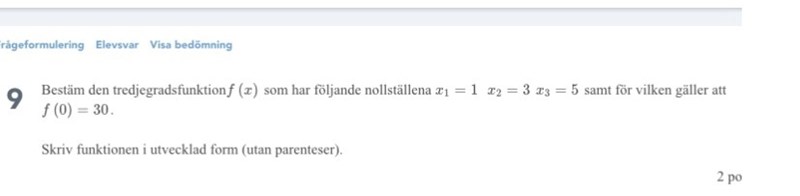Tomten skrev:Sätt f(x)= A(x-1)(x-3)(x-5) och utveckla parenteserna. A använder du för att få f(0)=30