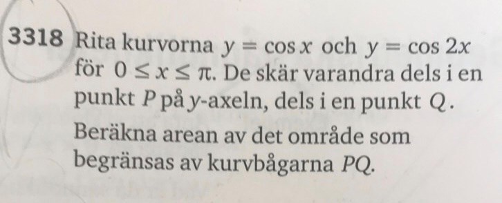Jag vet att den ena skärningspunkten är x=0, men den andra hittar man genom att likställa cos x med cos (2x). Dock kommer jag inte ihåg hur man löste ekvationer som dessa.