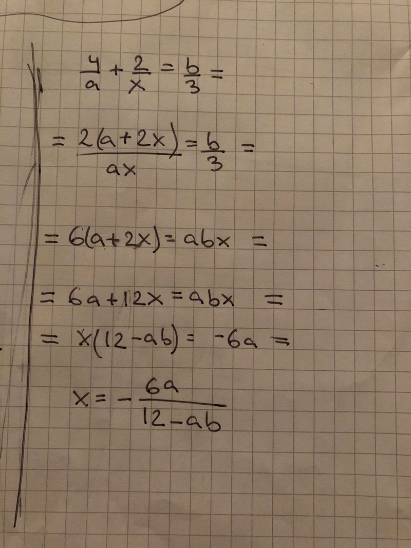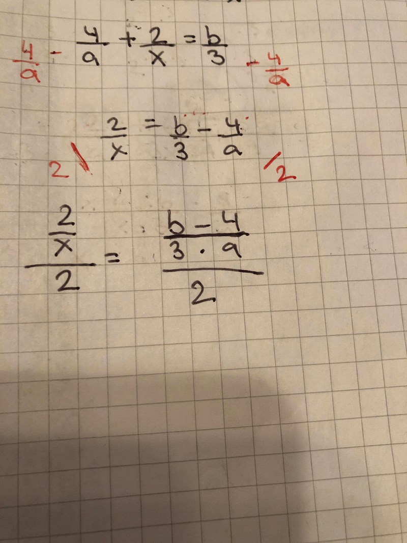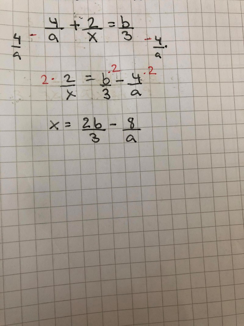 Om du multiplicerar hela ekvationen med 2 så blir ekvationen istället 4/x = 2b/3 - 8/a, vilket inte hjälper dig framåt.