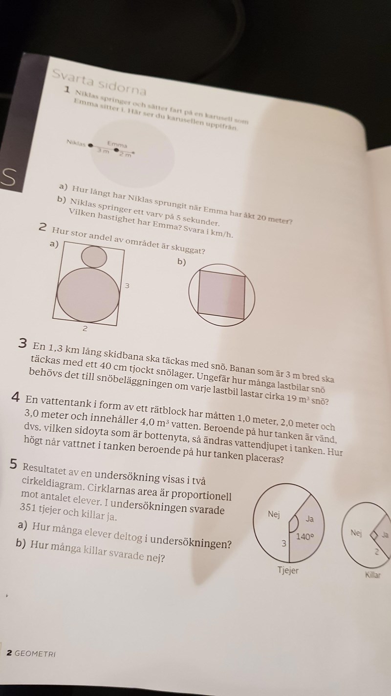 Stora cirkelns area = pi × 3 cm x 3 cm = 28,26 cm2. Och de som svarar ja är 140/360 x 28,26 cm2 = 10,99 cm2. Hur gör man sen?