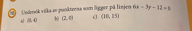 För a-uppgiften stoppar vi in att x = 0 och y = 4, så VL = 6x-3y-12 = 6.0-3.4-12 = 0-12-12 = -24 som inte är lika med 0, så punkten (0,4) ligger inte på linjen.