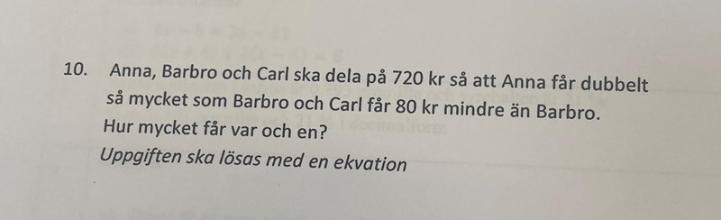 Sedan tecknar man ett uttryck och sätter det =720. Därefter löser man för x. När man gjort det kan man räkna ut vad övriga två får.
