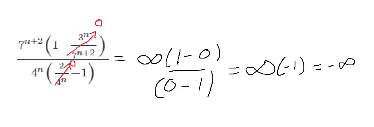 Det här ser väldigt problematiskt ut, då täljare och nämnare inte delar några faktorer. 7 och 3 är båda primtal, och i nämnaren finns det endast tvåor. Det jag har konstaterat är att funktionen kommer ge ett negativt värde för alla n>0. En idé jag har är att titta på täljare och nämnare separat och se vilken som växer eller minskar snabbast, dvs. blir 2-4n mindre snabbare än vad 7n+2-3n växer. Det kanske kan vara användbart på något sätt?