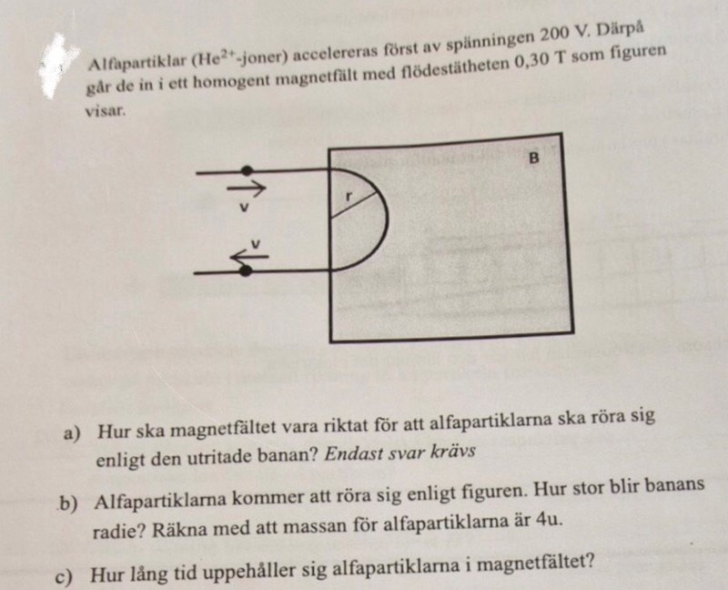 Du behöver också alfapartikelns hastighet, den kan du räkna ut med de givna uppgifterna