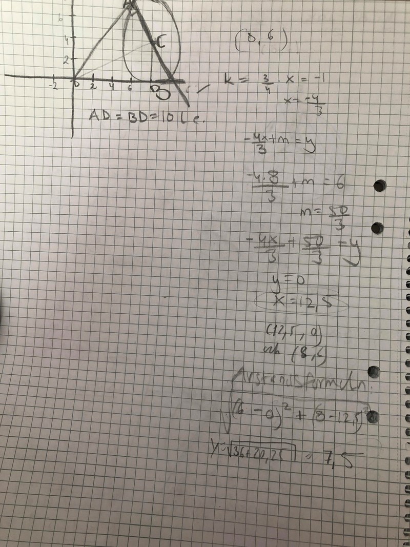 Vi har dels hittat ekvationen för linjen som är vinkel rät mot y=3x/4 och som skär grafen vid samma punkt dvs. vid punkten (8,6). Ekvationen för den linjen är y=(-4x/3) *x+50/3.