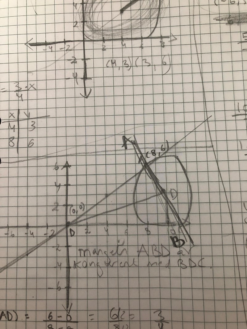 Det vi vill beräkna är mittpunkten av cirkeln som tangerar linjen y=3x/4 vid punkten (8,6).