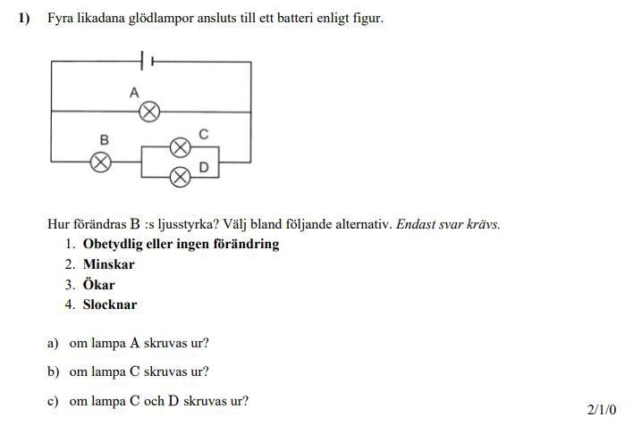 Om lampa C skruvas ur antar jag att motståndet minskar (?) så svaret på fråga b) skulle jag säga är 3
