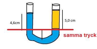 Två punkter i röret som befinner sig på samma höjd och som förbinds av en enda fas utsätts också för samma tryck. Om man drar en linje tvärs över u-röret enligt figuren nedan så är trycket vid linjen lika hög på vänster och höger sida. Kommer du vidare utifrån det?