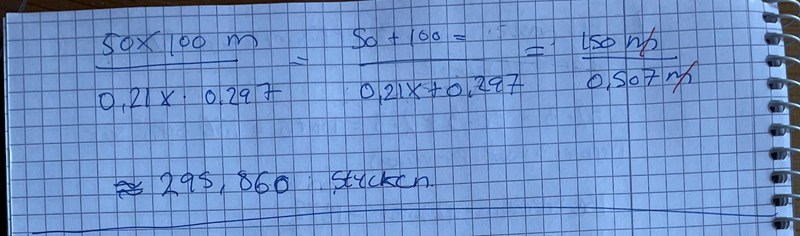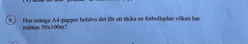 Så fotbollsplanet har en yta på 50 × 100 m2 = 5000 m2 = 5000 A0 = 16 × 5000 A4 = 80 000 A4.