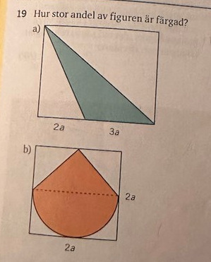 a) Tänk dig att rektangeln har höjden h. Då har du en rektangel och turkos triangel. Kommer du ihåg hur man räknar ut arean för en triangel och för en rektanget?