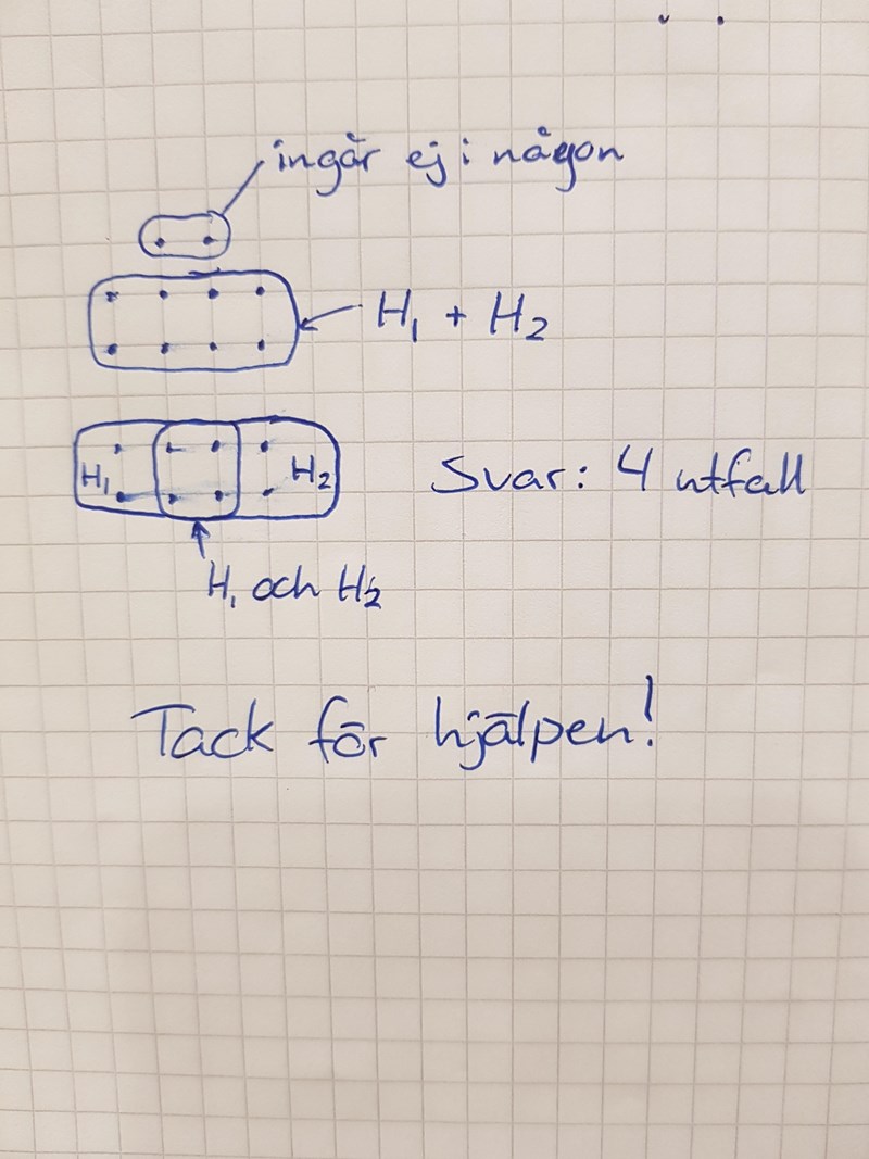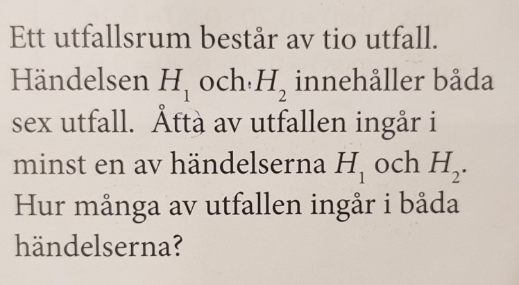 Tänk på att eftersom åtta av utfallen ingår i eller måste det betyda att två av utfallen varken är med i eller .