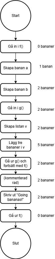 Vi börjar med att gå in i f(). I f() skapas två bananer och sparas i a och b. Sen som en del av f() går vi in i g(). Där läggs tre bananer i en lista, men ingen tar tillvara på den listan. När vi når den kommenterade raden har vi gått ur g() igen och listan v finns inte längre. Vi är dock kvar i f() där a och b fortfarande finns.