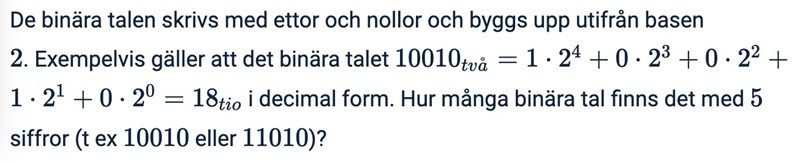 Jag har ingen idé, det var ett bra tag sedan jag lärde mig något om binära tal. Är ganska ringrostig när det gäller detta. Vad har du för förslag att man kan göra då? Exempelvis vet jag inte vad decimalsystemen är, varför vi har 90 stycken tvåsiffriga tal i decimalsystemet, och att det ska börja från tio till 99.