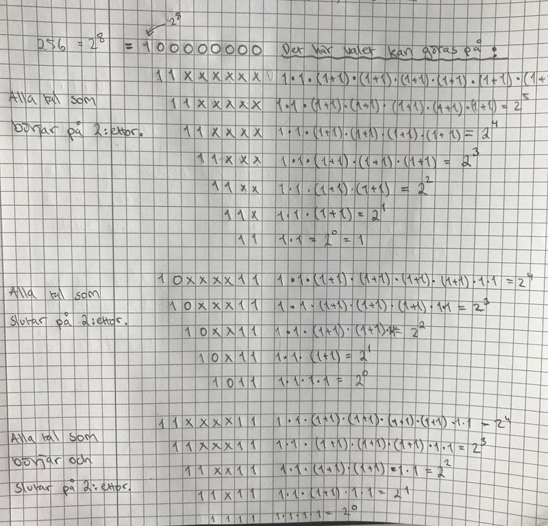 Hur många binära tal mindre än 256 börjar och/eller slutar med två ettor?