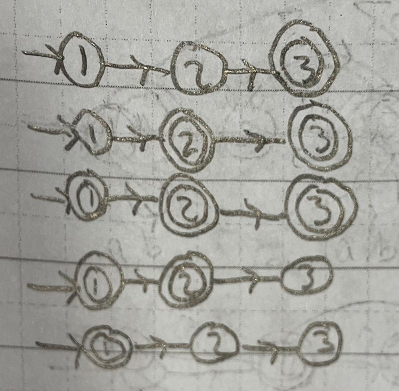 3 - Nu är alla möjliga kombinationer räknade en gång. Men det finns ytterligare 3 kombinationer, nämligen vilket tillstånd som är starttillståndet. Det finns 3 möjliga starttillstånd och därmed behöver de redan räknade kombinationerna multipliceras 3 gånger, 1 gång för varje potentiellt starttillstånd. Det slutgiltiga uttrycket kommer därför att bli
