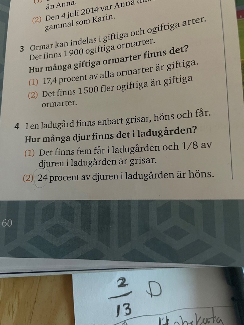 1/8 är 12,5 procent. Och antalet höns är 24%. Då borde de tillsammans vara 36.5 procent. Då måste 5 stycken får vara 63.5 av djuren.