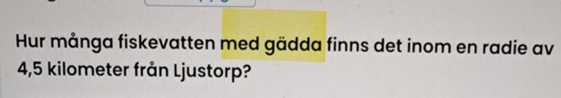 Yngve skrev:Aha. Då är nog felet att du tolkar uppgiften som att de frågar efter något som har med avstånd mellan fiskevatten med gädda och andra sorters fiskevatten?