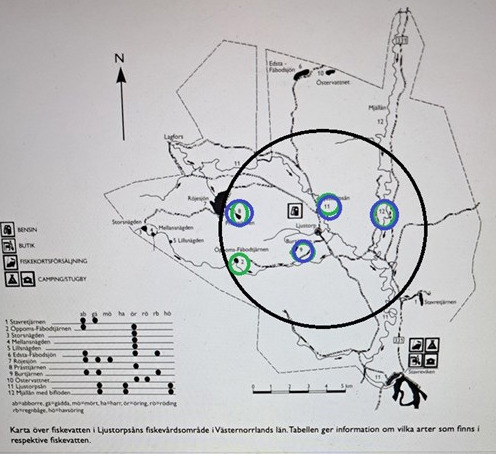 Om det är så att min cirkel är lagom stor (det är jag inte säker på), så finns det 5 fiskevatten inom 4,5 km från Ljustorp (markrade med grönt), och i 4 av dem (de som är markerade med blått) finns det gädda.