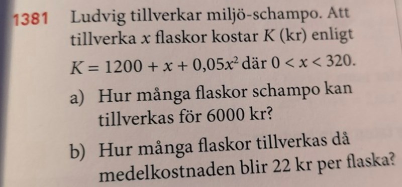 Ska man sätta 22*320 = 1200+x+0,05x^2 ... Jag vet att medelkostnad är totala kostnad / antal flaskor