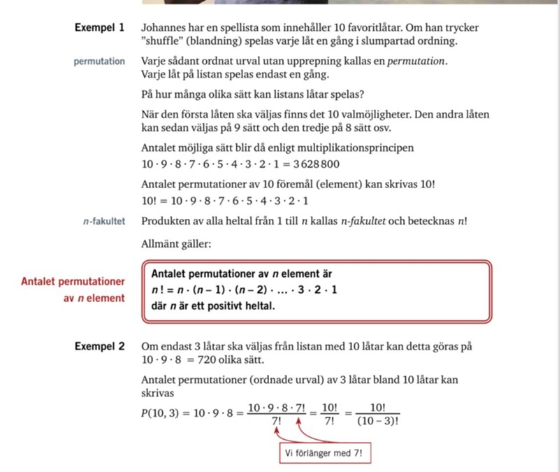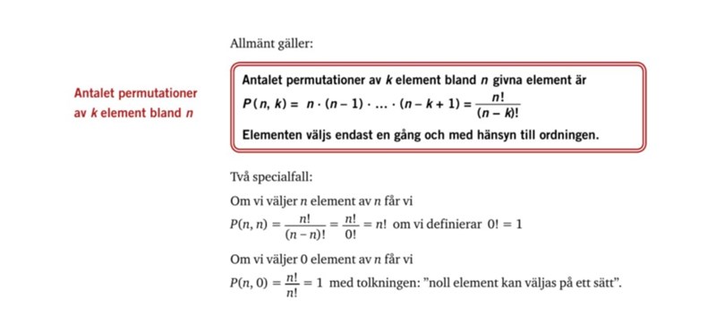 Vad är regeln som säger detta i definitionen av permutation? För antingen har jag inte lagt märke till det i min mattebok eller så står det inte. Från vad jag förstår är elementen som vi har 3, 5, 5, 9. Sen att man ska bestämma ”antalet permutationer av k element bland n”, eller i vårt fall, antalet permutationer av 4 element bland 4 element.