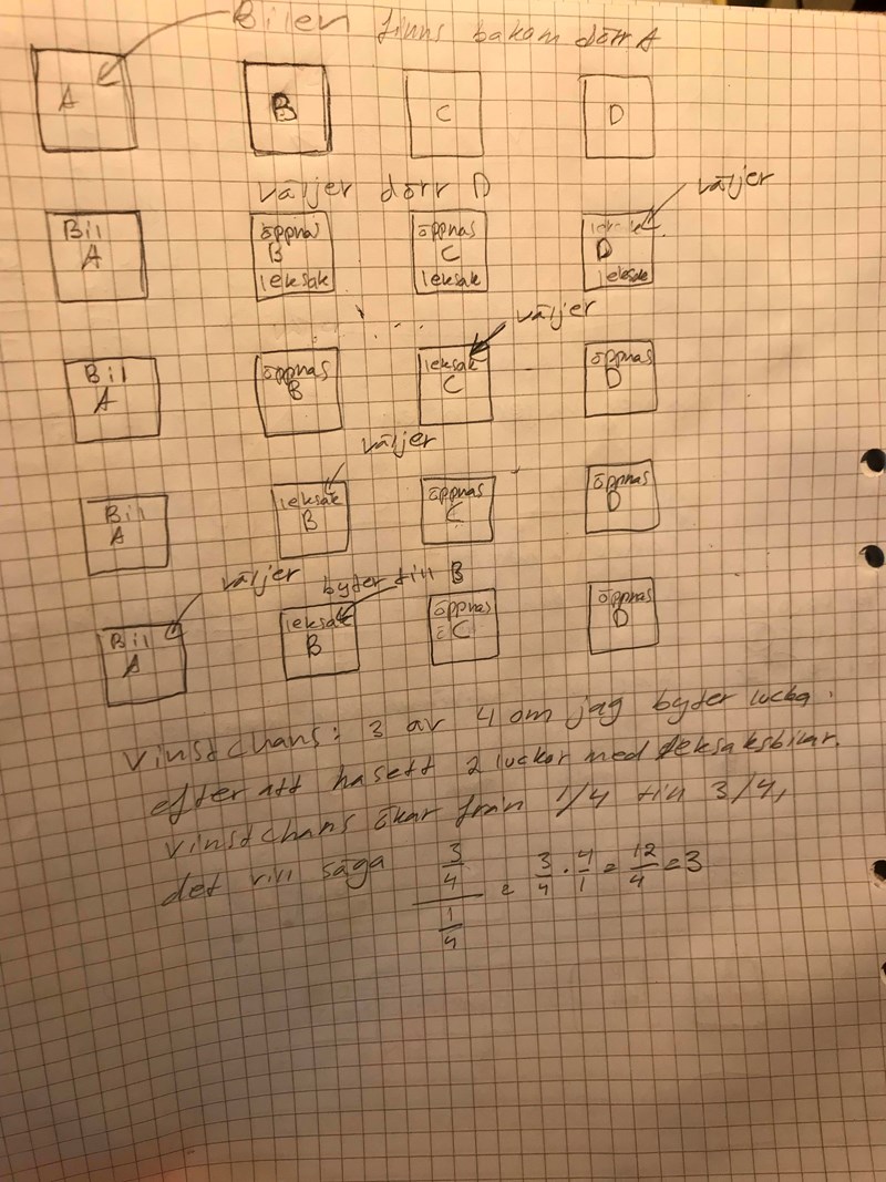 Smaragdalena skrev:Alltihop bygger på att programledaren vet vilken dörr som döljer den riktiga bilen. Om du hade valt dörr D, skulle programledaren kunnat öppna dörr B och C, precis som nu, men om du hade valt lucka B skulle programledaren hade kunnat öppna dörr C och ANTINGEN dörr A eller D, men alltid den som innehöll en leksaksbil.