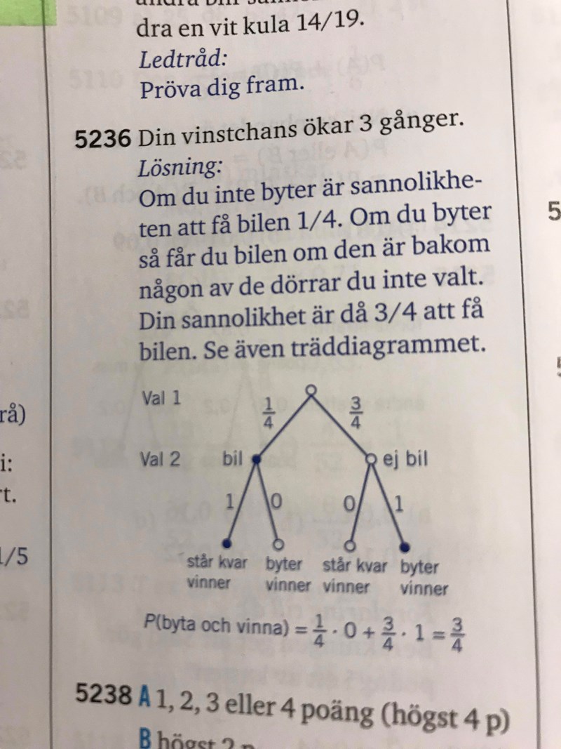 Jag undrar verkligen över denna uppgift och om den som konstruerat den samt gjort facit vet vad den sysslat med. Denna uppgift är väl ett Monty Hall-problem: https://sv.wikipedia.org/wiki/Monty_Hall-problemet.