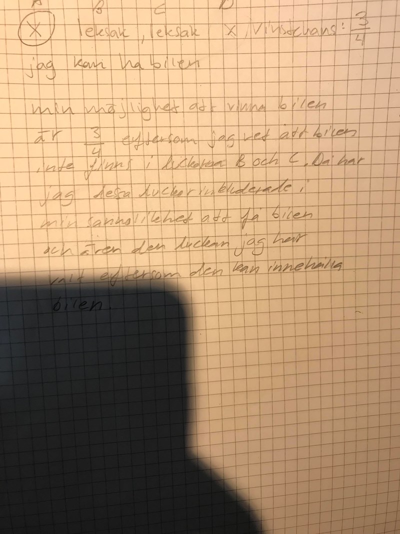 Jag har gjort en figur med möjliga antal utfall. Det blir totalt fyra utfall med vinst i tre av dem. Problemet var ursprungligen att jag bytte plats på vilken lucka bilen var på. Bilen är från början i en lucka, och då kan man välja den luckan bilen är på. Bilen hoppar inte från lucka A till lucka D, t.ex. Där hade jag gjort ett antagande som inte stämde.