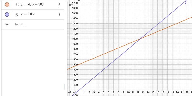 hjäälp skrev:Har på uppgift a) skrivit så här: y=80x och y=40x+500