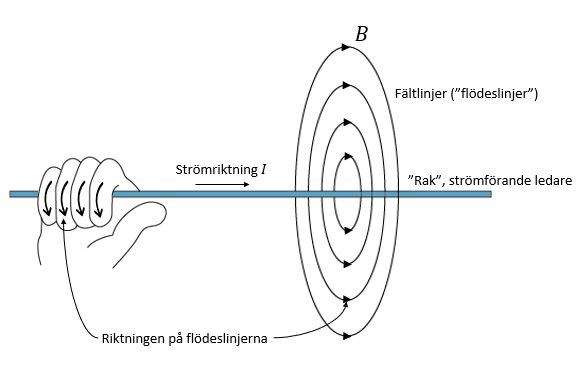 (strömmen i ledaren till vänster är neråt, från N till S)