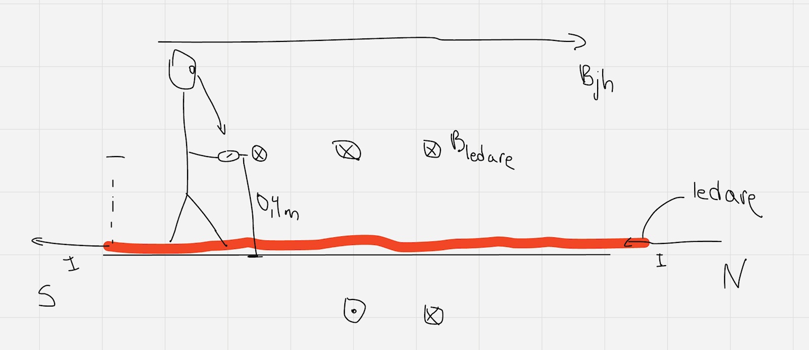 Aa precis jag får mha högerhandsregeln att fältets riktning är åt vänster från punkten 0.4 m ovanför markledningen när strömmen går från nord till syd. Hur ska jordmagnetiska fältet vara riktad?