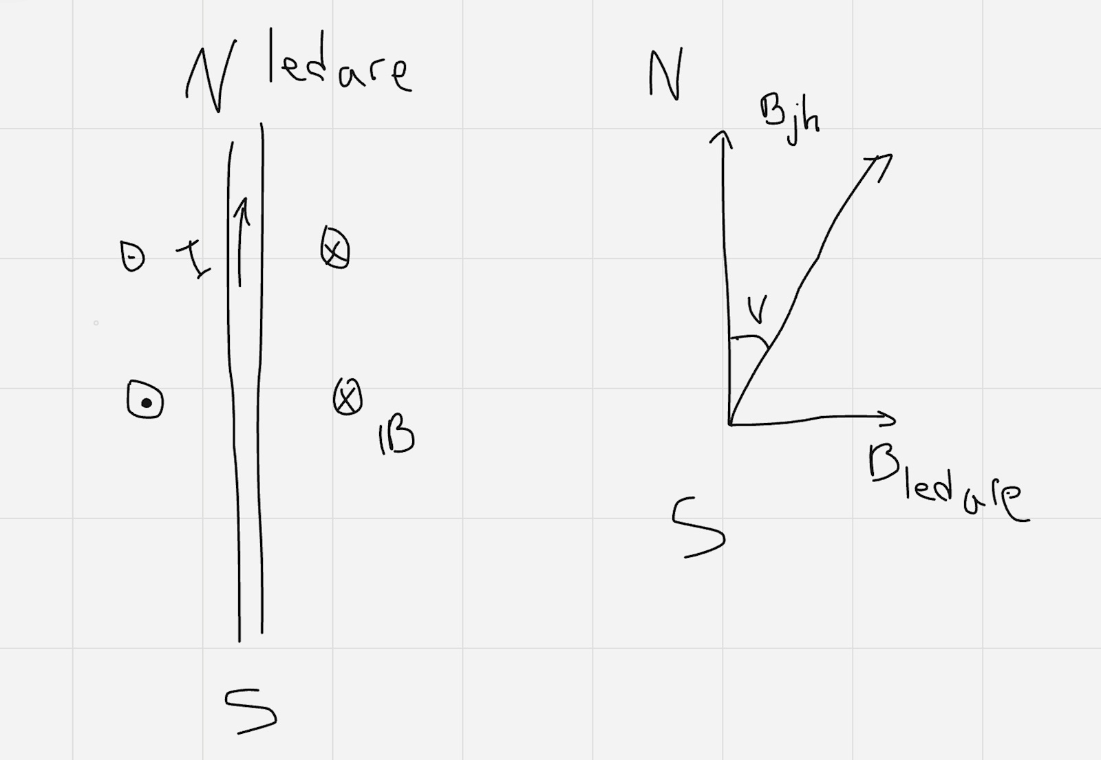 Men om man nu sätter bjh där Bledare är på så förstår jag ej varför Bledare ska peka nedåt ? Jag antar Bjh (horisontalkomposanten) ska alltid peka typ horisonetellt pga dess namn. Såsom jag ritade kompassen så ser jag ej mha högerhandsregeln att B-fältet pekar nedåt. Liksom den går från norr utåt till syd igen.