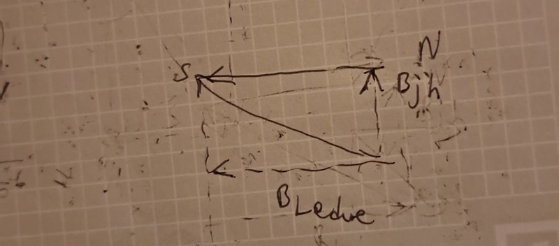 Din skiss i #12 är fel eftersom Bledare går från öst till väst, inte norr till söder (notera att det är jordens väderstreck och har inte med någon magnet att göra). Sedan är Bjh jordens magnetfält som går från söder till norr enligt väderstrecken men går som vanligt mot jordens magnetfälts sydpol (som i alla magneter). Att dessa är olika beror på det jag skickade i #11.