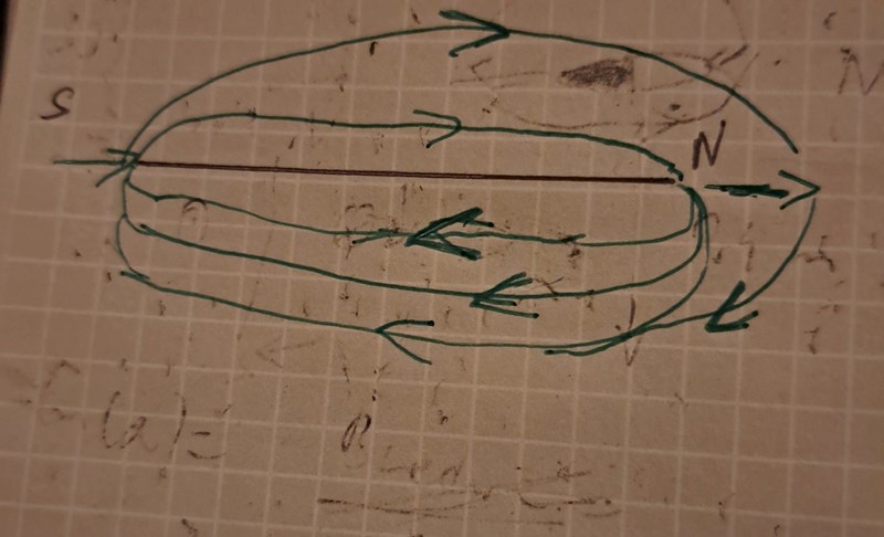 Jag förstår ej hur ledare är rakt ovanifrån som går från söder till norr? För du ritade ledare rakt men om jag ritar den såsom jag gjorde så förstår jag ej varför mina fältlinjer är felaktiga? Asså är det ej detta ledare från sidan ? Sen har jag för mig fält linjer går från norr till syd och sen syd till norr så som bilden i #8 visar.