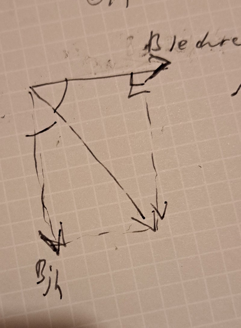Du har ritat två oförståeliga figurer. Så jag väljer den första som heter från sidan. Du ritar bjh åt höger och sen sätter du kryss och skriver Bledare. Jag förstår ej varför du sätter kryss och det saknas fältlinjer från norr till syd för B-fältet hos ledare. Nu vet jag ej hur du tänker i den där högra figuren men om bjh är riktad horisontellt så kan man se att Bledare kommer att vara riktad åt vänster,men du tänker att Bledare är riktad uppåt. Varför? Visa med massa fältlinjer så man är med på det för jag kan ej se med ord hur fältlinjer går.