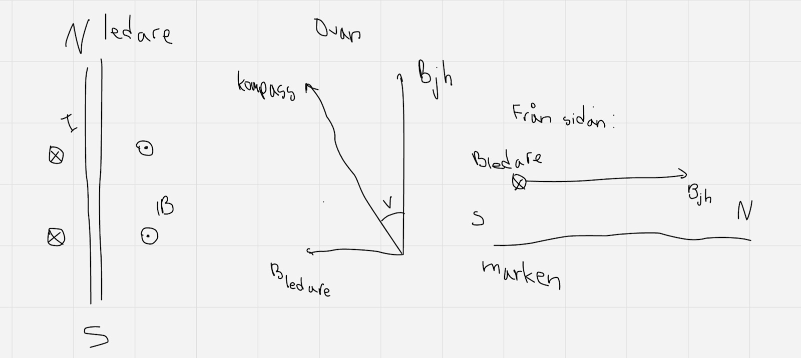 Vi tittar från sidan så Bjh blir horisontell här (som är mer naturligt att förstå kanske). Ledaren går ju också längs marken men dess magnetfält rör sig runt ledaren. I punkten rakt ovanför ledaren (där personen håller kompassan) är den riktat in i pappret.