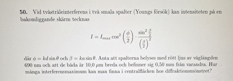 Först behöver man veta vad k, d och a är. Sedan kan det hjälpa att rita en graf av intensitet som funktion av vinkeln .
