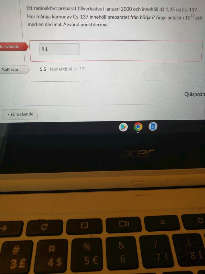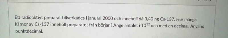 Jag vet att vi ska använda N=N0*e^-lambda*t och N0 sökes. Men problemet är att vi har en given massa i nano och jag tar den och omvandlar till kg för att sedan dela med 137 u multiplicerat med 1,66054*10^-27. Men jag får inget med 10^12, vad gör jag för fel??