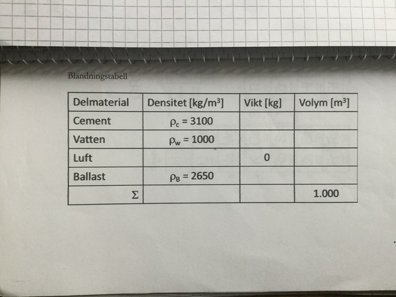 hej .Med mängden vatten 165 kg/m^3 och med mängden cement 250 kg/m^3 hur många kilogram ballast ska blandas i betongblandningen? (Du kan räkna med normalt luftinnehåll 2% och utan justering för ballasttyp)