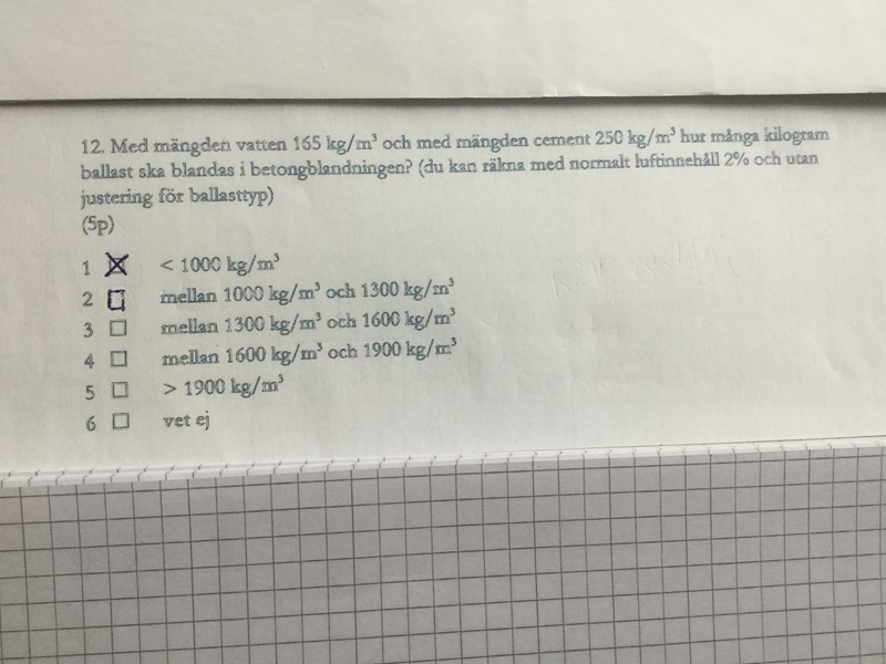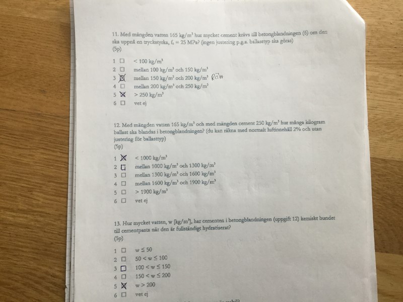 Förlåt jag glömde bifoga bild på hela tabellen sida.svaret på föra frågan oxå den Reduceras till mellan 175 och 185 kg dvs alternativt 3.kan det vara så att fråga 11 och 12 har ett samband eftersom det är samma vatten mängd 165 kg/m3?