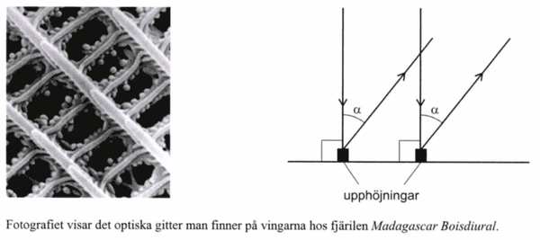 De imponerande färgmönstren på många fjärilars vingar bildas vid reflektion i mikroskopiska strukturer i vingarnas yta. Ytan på fjärilens vingar fungerar som ett reflektionsgitter.