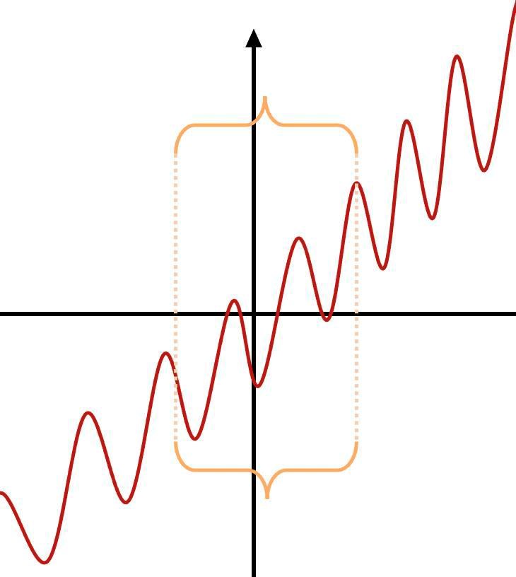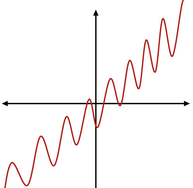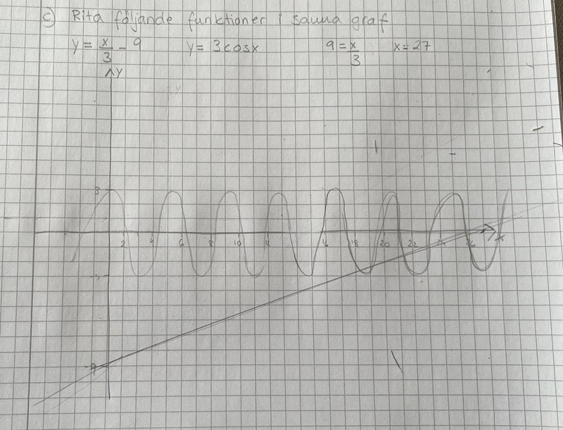 Tanken i denna uppgift är följande: En funktion bestående av en rät linje, y=x3y=\frac{x}{3} och en sinus- eller cosinusfunktion, -3cos(x)-3\cos{(x)} kommer att gå uppåt, men kommer också att oscillera (pendla upp och ned) som en sinus-/cosinusfunktion gör. Utseendet kommer därmed att vara något i denna stil: