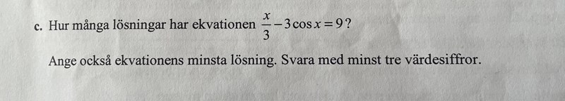 Ett förslag är att du börjar med att derivera funktionen f(x)=x3-3cos(x)-9f(x)=\frac{x}{3}-3\cos{(x)}-9. Vad blir derivatan? Hur många nollställen har den? Vad säger detta om funktionen? :)